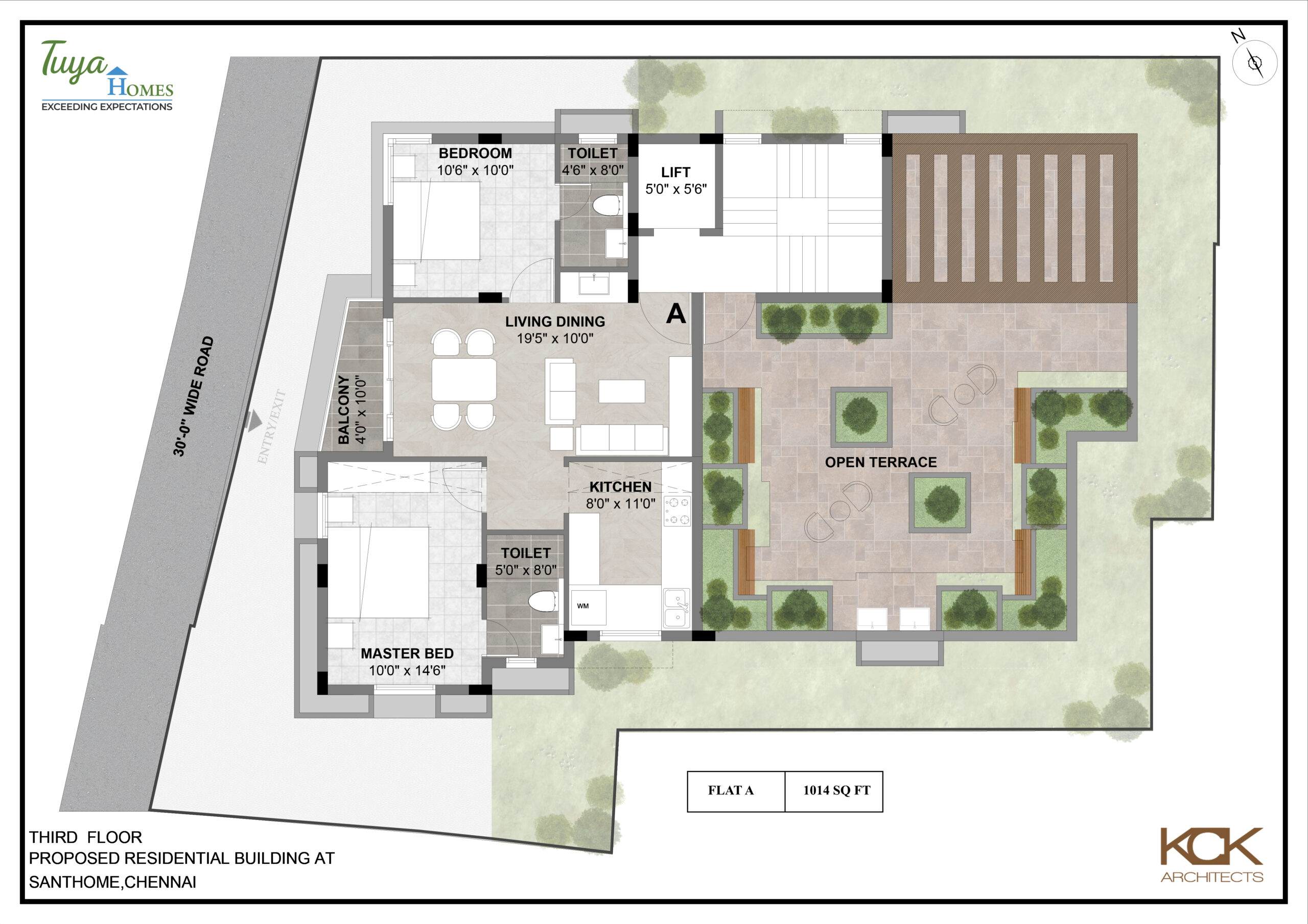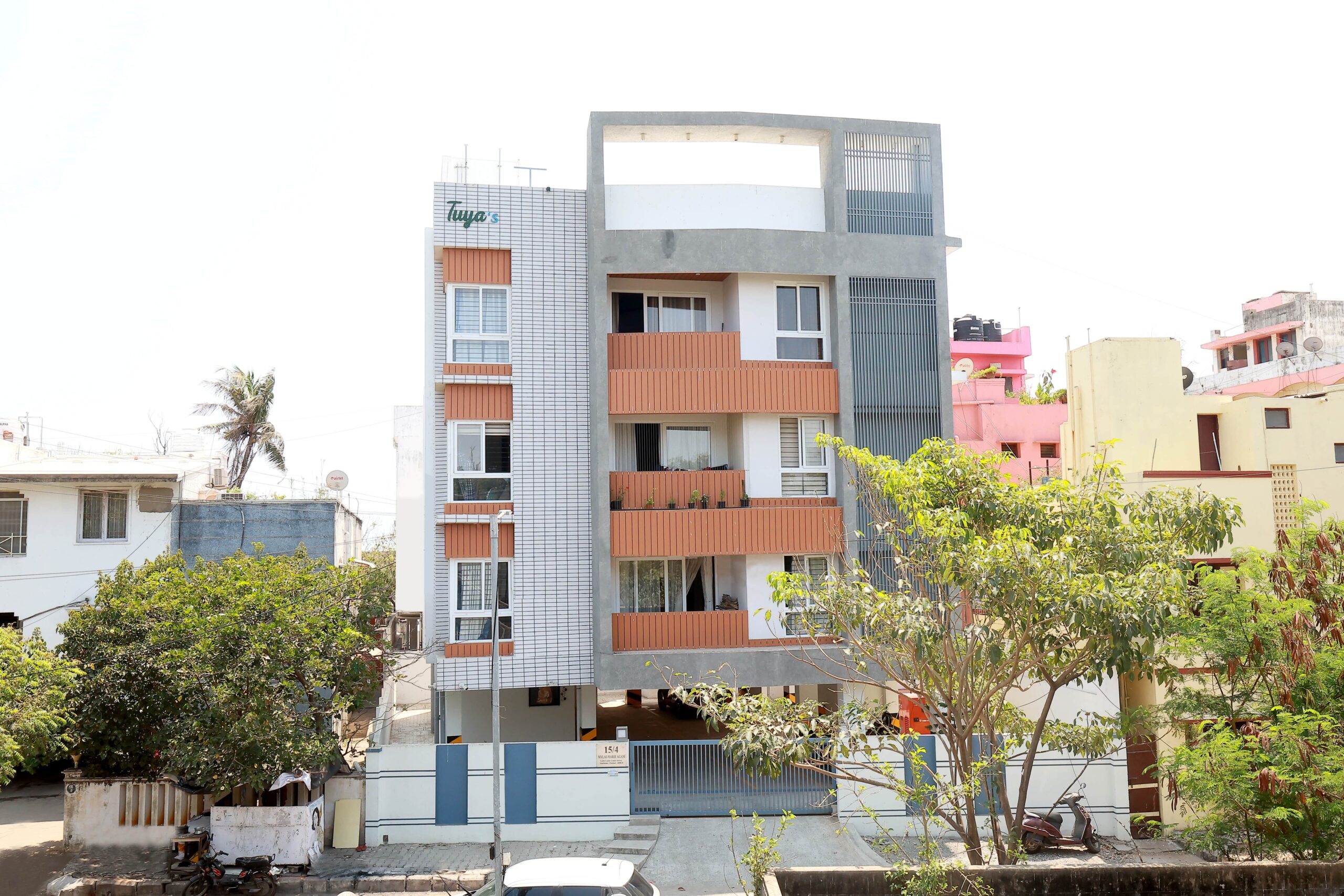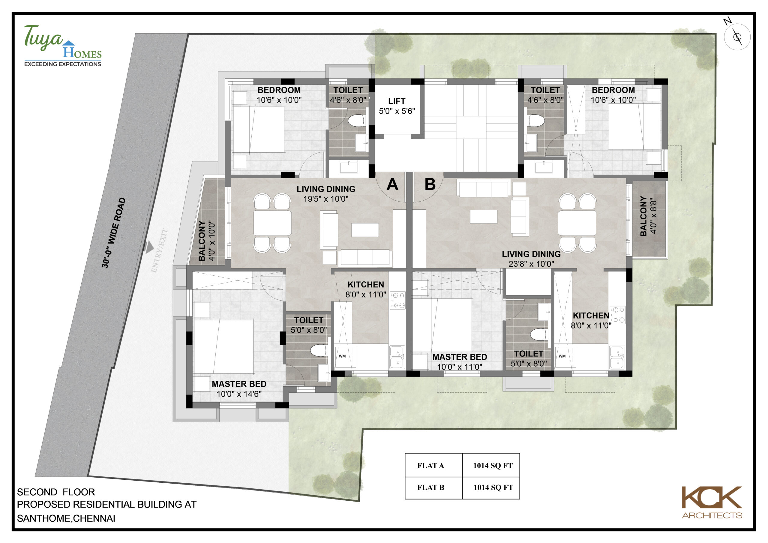 The proposed building is a Stilt (Car Park) + 3 Floors (3rd floor only part) consisting of 5 flats, each 2 BHK measuring 1014 sq. ft. and designed by Architect, Kaviya Kumar.